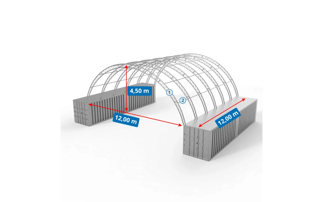 Kontejnerové zastřešení 12x12 m je inovativní stanové řešení pro ochranu prostoru mezi kontejnery v logistice, skladech i na stavenišť. Spolehlivě kryje před deštěm, sněhem a silným sluncem. Plachta z odolného PVC materiálu zajišťuje vysokou odolnost a dlouhou životnost; modulární konstrukce umožňuje rychlou instalaci na kontejnery. Na přání lze prostor uzavřít ze všech stran a doplnit o vjezdová brána nebo vstupní dveře. Zeptejte se na dostupné varianty.