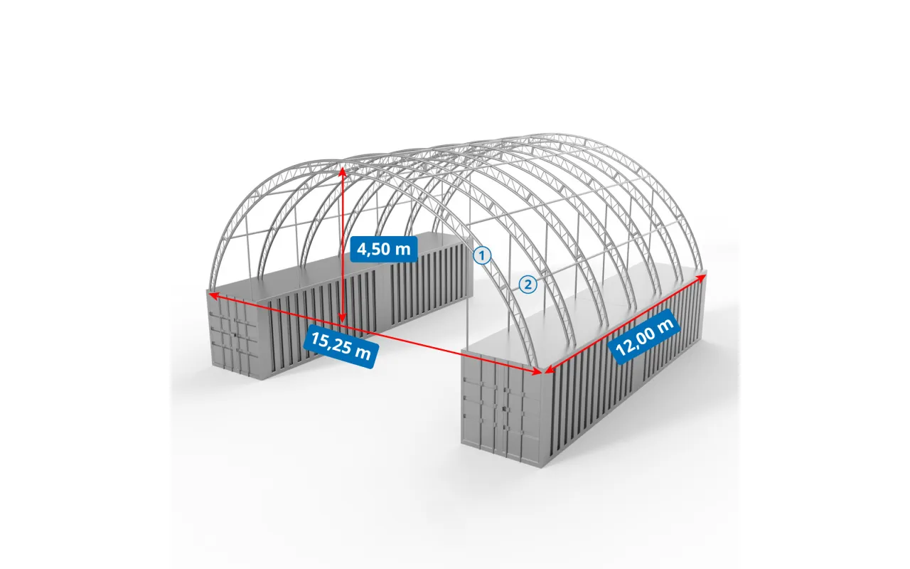 Kontejnerové zastřešení zesílené 15,25x12 m je praktické řešení pro ochranu prostoru mezi kontejnery v logistice, skladech i na stavenišť. Poskytuje spolehlivou ochranu před deštěm, sněhem a intenzivním sluncem. zesílené kontejnerové zastřešení 15,25x12 m je vyrobené z odolného PVC materiálu, což podporuje dlouhou životnost a odolnost. Na přání lze prostor uzavřít ze všech stran a doplnit o vjezdová brána nebo vstupní dveře. Rychlá montáž umožní snadné přemístění podle aktuálních potřeb.