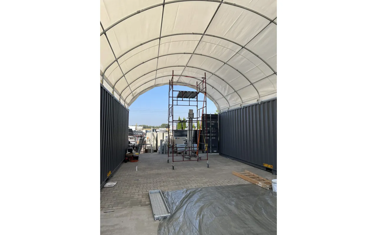 Kontejnerové zastřešení 6x12 m je flexibilní stanové zastřešení určené k ochraně prostoru mezi kontejnery. Pro logistických firem, sklady i stavenišť poskytuje jistotu provozu v dešti, sněhu i při silném slunci. Plachta z odolného PVC materiálu podporuje dlouhodobé používání a vysokou odolnost. Modulární rám umožňuje rychlou instalaci na kontejnery a snadné přizpůsobení. Na přání vytvoříme uzavřený prostor včetně vjezdová brána nebo vstupní dveře. Požádejte o konfiguraci.
