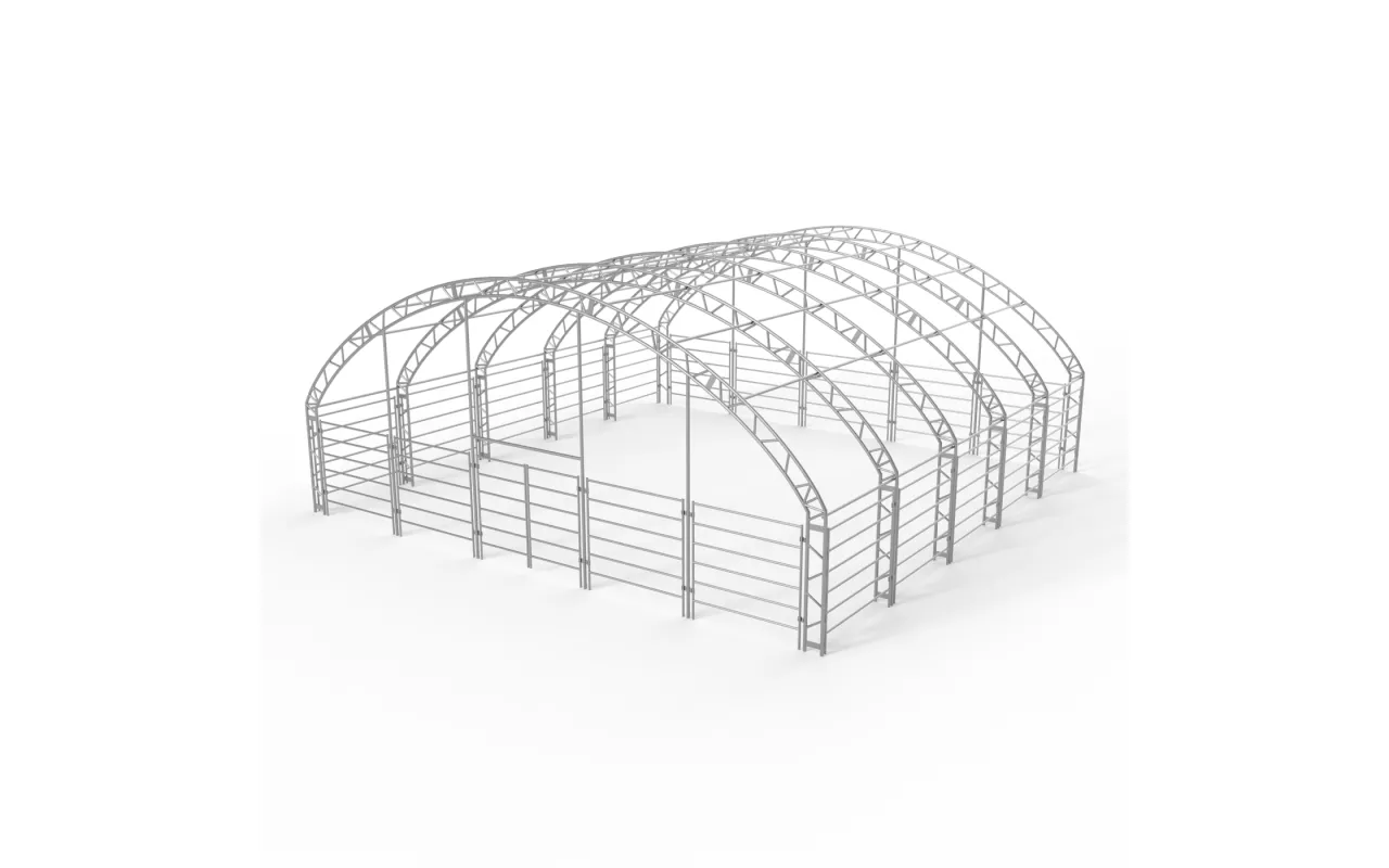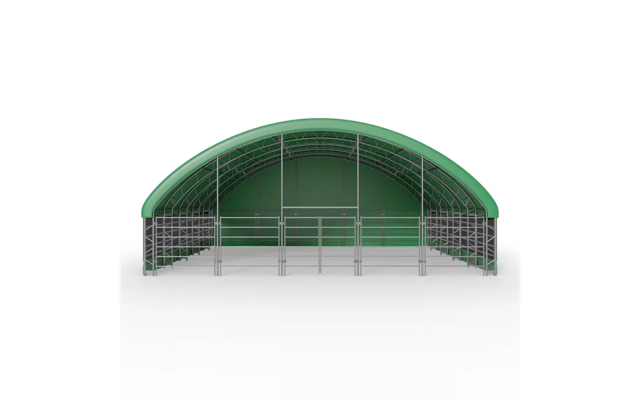 Konstrukce Přístřešek pro zvířata 12x12 m PVC 750 g/m² se vyznačuje použitím nosných trubek a spojek se zvětšeným průměrem, což přispívá ke zvýšení pevnostních parametrů celého systému. Srdcem naší konstrukce je ocel, proto jsme použili za studena válcovanou konstrukční ocel. Kromě toho jsou prvky rámu perforovány, čímž se eliminují svary, neboť tato technologie zajišťuje nejvyšší odolnost konstrukce vůči statickému a dynamickému zatížení a zabraňuje potenciálním deformacím. Pro ochranu rámu v ohradě pro zvířata jsme ocelové komponenty podrobili procesu galvanického pozinkování. Tato metoda poskytuje komplexní ochranu proti korozi za vnitřních i vnějších podmínek. Díky tomu vykazují ocelové trubky vysokou odolnost vůči korozi. Střešní a boční napínací systém se skládá z ocelových lan, což zajišťuje stabilitu konstrukce, která se nedeformuje a zůstává pevná po celou dobu používání. Tím se také chrání plachta před tlakem sněhu a větru. Vnitřní napínací systém je u Přístřešek pro zvířata 12x12 m PVC 750 g/m² klíčový, protože udržuje materiál napnutý, čímž zabraňuje tvorbě záhybů a hromadění vody na povrchu plachty. Díky tomu je hala lépe chráněna před nepříznivými povětrnostními podmínkami, jako je silný vítr či déšť. Tento systém rovněž přispívá k estetice stanu a zajišťuje mu bezchybný a profesionální vzhled.