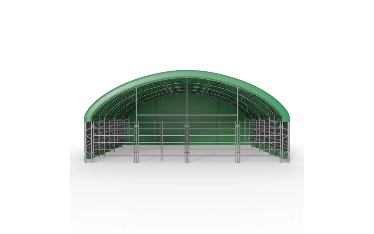 Konstrukce Přístřešek pro zvířata 10x10 m PVC 900 g/m² se vyznačuje použitím nosných trubek a spojek se zvětšeným průměrem, což přispívá ke zvýšení pevnostních parametrů celého systému. Srdcem naší konstrukce je ocel, proto jsme použili za studena válcovanou konstrukční ocel. Kromě toho jsou prvky rámu perforovány, čímž se eliminují svary, neboť tato technologie zajišťuje nejvyšší odolnost konstrukce vůči statickému a dynamickému zatížení a zabraňuje potenciálním deformacím. Pro ochranu rámu v ohradě pro zvířata jsme ocelové komponenty podrobili procesu galvanického pozinkování. Tato metoda poskytuje komplexní ochranu proti korozi za vnitřních i vnějších podmínek. Díky tomu vykazují ocelové trubky vysokou odolnost vůči korozi. Střešní a boční napínací systém se skládá z ocelových lan, což zajišťuje stabilitu konstrukce, která se nedeformuje a zůstává pevná po celou dobu používání. Tím se také chrání plachta před tlakem sněhu a větru. Vnitřní napínací systém je u Přístřešek pro zvířata 10x10 m PVC 900 g/m² klíčový, protože udržuje materiál napnutý, čímž zabraňuje tvorbě záhybů a hromadění vody na povrchu plachty. Díky tomu je hala lépe chráněna před nepříznivými povětrnostními podmínkami, jako je silný vítr či déšť. Tento systém rovněž přispívá k estetice stanu a zajišťuje mu bezchybný a profesionální vzhled.