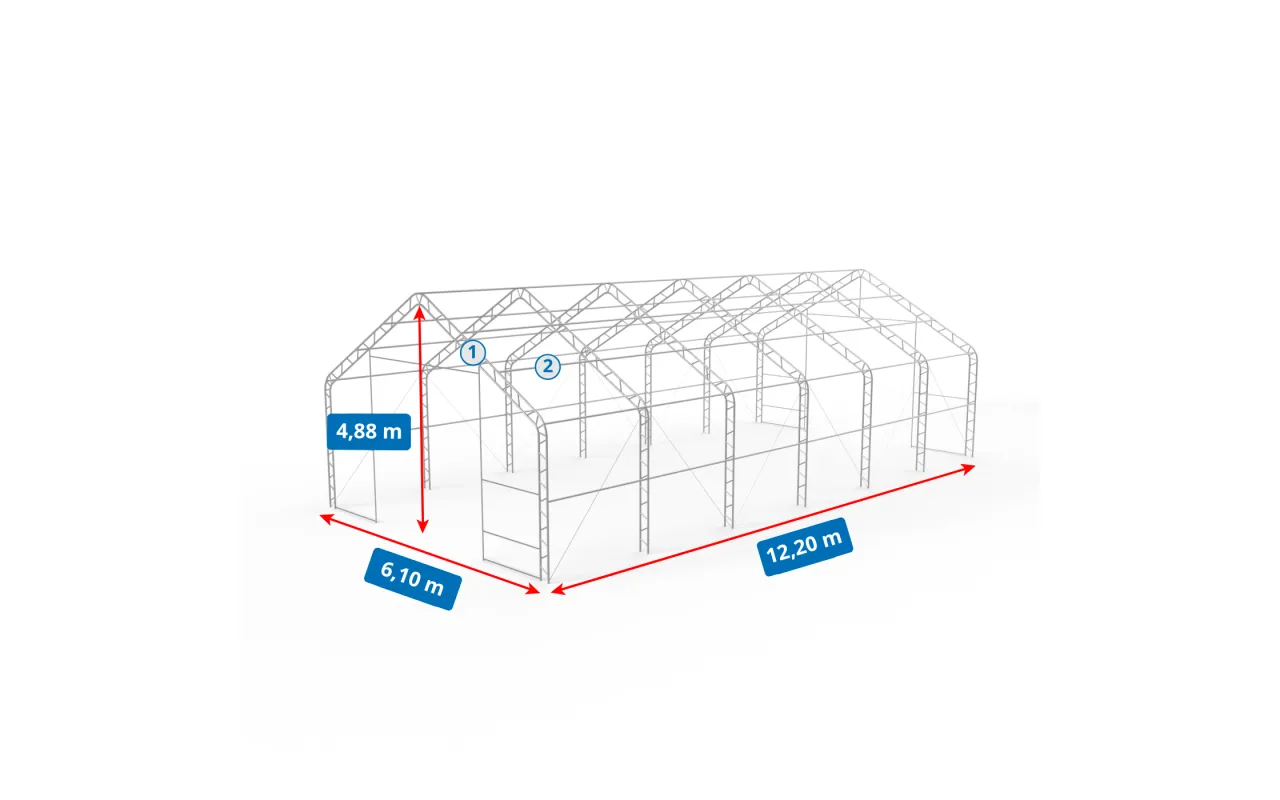 Stěnová konstrukce haly se sedlovou střechou se vyznačuje svislé a vysoké stěny, díky nimž efektivně využijete skladovací prostor po celé délce bočních stěn. stanová hala se sedlovou střechou 6,1x12,2 m je univerzální řešení pro průmyslové odvětví, zemědělství i skladování. strmá střešní konstrukce podporuje správné sklouzávání sněhu a odvod deště a snižuje riziko přetížením extrémními povětrnostními podmínkami. Rychlá montáž umožní pružně reagovat na změny provozu. Model stanová hala se šikmou střechou je vhodný jako skladovací stan pro spolehlivý celoroční provoz. Vyžádejte si nabídku a termín dodání.