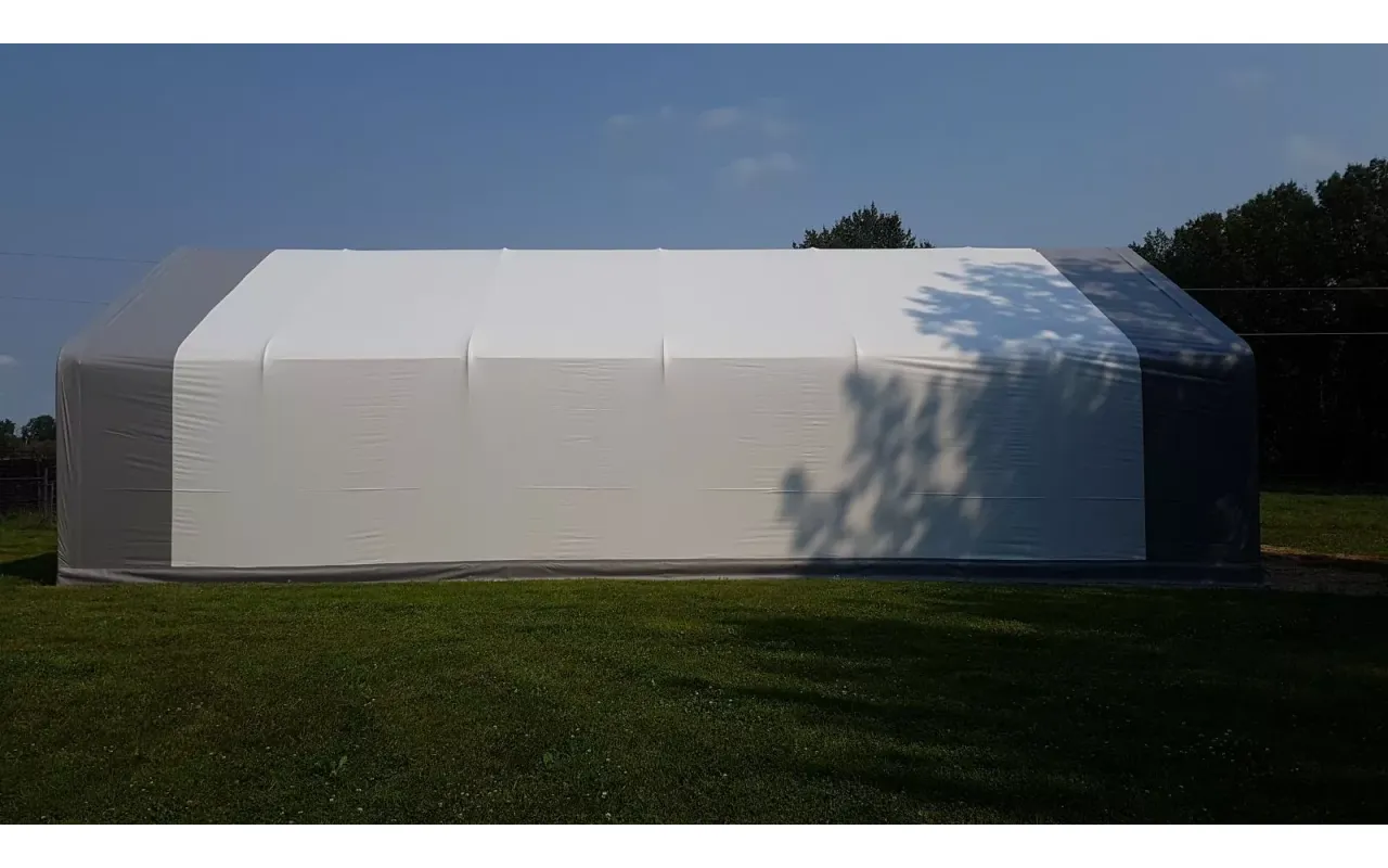 Stanová hala se sedlovou střechou 9,15x24,4 m PVC 750 g/m² se vyznačuje výjimečným materiálem, který je speciálně přizpůsoben náročným klimatickým podmínkám v Polsku. Použití vysoce kvalitního PVC materiálu, který vděčí za svou kvalitu mimo jiné hustému vláknovému tkaní, zajišťuje odolnost proti zatížení způsobenému sněhem a větrem. UV záření způsobuje degradaci materiálů, ze kterých jsou plachty vyrobeny, a proto jsme použili dodatečnou laminaci povrchu, která vytváří ochrannou vrstvu proti ultrafialovému záření. Díky tomu se naši zákazníci nemusí obávat, že by se plachta v průběhu let začala drolit a ničit. Závěrem lze říci, že použití PVC materiálu s gramáží 750g nebo 900g/m² a přídavné ochranné vrstvy se odměňuje tím, že se na něm méně usazuje špína a značně usnadňuje údržbu čistoty, zejména při čištění pomocí tlakových čističů. Tato investice se promítá do dlouhodobého estetického vzhledu stanu a ochrany před poškozením. Použití vysoce kvalitní plachty poskytuje klíčové vlastnosti, jako je nehořlavost, voděodolnost a mrazuvzdornost, což z ní činí nezbytné řešení pro mnoho odvětví.