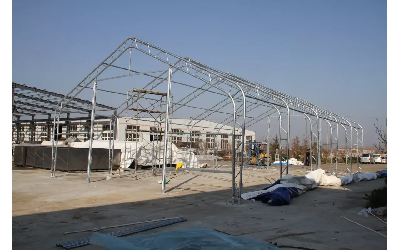 Konstrukce stanu Stanová hala se sedlovou střechou 10x12,2 m PVC 900 g/m² se vyznačuje použitím nosných trubek a spojek se zvětšeným průměrem, což přispívá ke zvýšení pevnostních parametrů celého systému. Srdcem naší konstrukce je ocel, proto jsme použili za studena válcovanou konstrukční ocel. Kromě toho jsou prvky rámu perforovány, čímž se eliminují svary, neboť tato technologie zajišťuje nejvyšší odolnost konstrukce vůči statickému a dynamickému zatížení a zabraňuje potenciálním deformacím. Pro ochranu rámu (Stanové haly se sedlovou střechou) jsme ocelové komponenty podrobili procesu galvanického pozinkování. Tato metoda poskytuje komplexní ochranu proti korozi za vnitřních i vnějších podmínek. Díky tomu vykazují ocelové trubky vysokou odolnost vůči korozi. Střešní a boční napínací systém se skládá z ocelových lan, což zajišťuje stabilitu konstrukce, která se nedeformuje a zůstává pevná po celou dobu používání. Tím se také chrání plachta před tlakem sněhu a větru. Vnitřní napínací systém je u Stanová hala se sedlovou střechou 10x12,2 m PVC 900 g/m² klíčový, protože udržuje materiál napnutý, čímž zabraňuje tvorbě záhybů a hromadění vody na povrchu plachty. Díky tomu je hala lépe chráněna před nepříznivými povětrnostními podmínkami, jako je silný vítr či déšť. Tento systém rovněž přispívá k estetice stanu a zajišťuje mu bezchybný a profesionální vzhled.