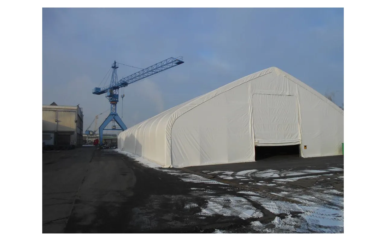Stanová hala se sedlovou střechou 21,35x61 m PVC 900 g/m² se vyznačuje výjimečným materiálem, který je speciálně přizpůsoben náročným klimatickým podmínkám v Polsku. Použití vysoce kvalitního PVC materiálu, který vděčí za svou kvalitu mimo jiné hustému vláknovému tkaní, zajišťuje odolnost proti zatížení způsobenému sněhem a větrem. UV záření způsobuje degradaci materiálů, ze kterých jsou plachty vyrobeny, a proto jsme použili dodatečnou laminaci povrchu, která vytváří ochrannou vrstvu proti ultrafialovému záření. Díky tomu se naši zákazníci nemusí obávat, že by se plachta v průběhu let začala drolit a ničit. Závěrem lze říci, že použití PVC materiálu s gramáží 750g nebo 900g/m² a přídavné ochranné vrstvy se odměňuje tím, že se na něm méně usazuje špína a značně usnadňuje údržbu čistoty, zejména při čištění pomocí tlakových čističů. Tato investice se promítá do dlouhodobého estetického vzhledu stanu a ochrany před poškozením. Použití vysoce kvalitní plachty poskytuje klíčové vlastnosti, jako je nehořlavost, voděodolnost a mrazuvzdornost, což z ní činí nezbytné řešení pro mnoho odvětví.