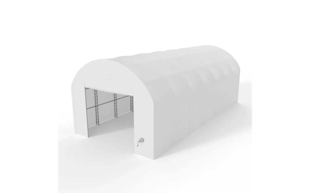 Plachtová hala se svislými bočními stěnami 6,1x9,15 m PVC 900 g/m² využívá ocelový rám v uspořádání dvoubodové příhradové konstrukce, který zvyšuje tuhost celku a usnadňuje bezpečný provoz v proměnlivých povětrnostních podmínkách. Plášť z PVC plachty dostupný ve variantě 750 g/m² (standardní) nebo 900 g/m² (zesílené) zajišťuje odolnost vůči dešti, sněhu, větru i UV záření. Hala je vybavena mechanickou bránou ovládanou ručně, bez automatizace, což zjednodušuje používání a snižuje riziko poruch. Rozměr brány (šířka × výška): 3,66 x 3,4 m – parametr umožňuje přizpůsobit vjezd strojům a vozidlům používaným v provozu.
