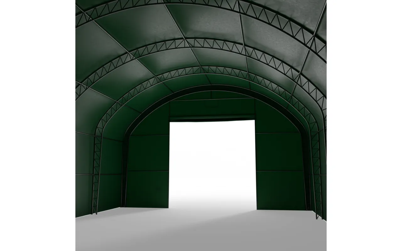 Plachtová hala se svislými bočními stěnami 12,2x18,3 m PVC 750 g/m² v zeleném provedení využívá ocelový rám v uspořádání dvoubodové příhradové konstrukce, který zvyšuje tuhost celku a usnadňuje bezpečný provoz v proměnlivých povětrnostních podmínkách. Plášť z PVC plachty dostupný ve variantě 750 g/m² (standardní) nebo 900 g/m² (zesílené) zajišťuje odolnost vůči dešti, sněhu, větru i UV záření. Hala je vybavena mechanickou bránou ovládanou ručně, bez automatizace, což zjednodušuje používání a snižuje riziko poruch. Rozměr brány (šířka × výška): 6,1 x 4,5 m – parametr umožňuje přizpůsobit vjezd strojům a vozidlům používaným v provozu.