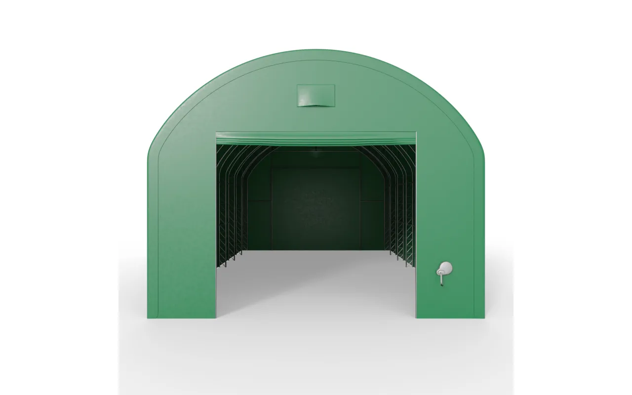 Zelená varianta obloukové haly se svislými bočními stěnami je praktický pracovní prostor pro každodenní nasazení na farmách i u servisních firem. Ocelový rám a plachta PVC 750 g/m² chrání před srážkami, větrem i UV zářením a zároveň zachovávají pravidelnou, předvídatelnou geometrii interiéru. Svislé stěny pomáhají využít celou šířku bez ztrát u boků. Konzultujte s poradcem Gazelt, jak halu nejlépe přizpůsobit vašemu použití.