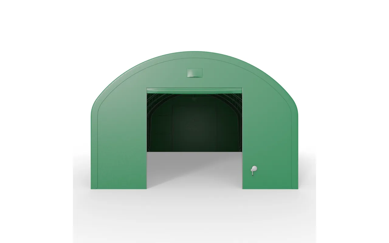 Plachtová hala se svislými bočními stěnami 9,15x12,2 m PVC 900 g/m² v zeleném provedení využívá ocelový rám v uspořádání dvoubodové příhradové konstrukce, který zvyšuje tuhost celku a usnadňuje bezpečný provoz v proměnlivých povětrnostních podmínkách. Plášť z PVC plachty dostupný ve variantě 750 g/m² (standardní) nebo 900 g/m² (zesílené) zajišťuje odolnost vůči dešti, sněhu, větru i UV záření. Hala je vybavena mechanickou bránou ovládanou ručně, bez automatizace, což zjednodušuje používání a snižuje riziko poruch. Rozměr brány (šířka × výška): 4,27 x 4,5 m – parametr umožňuje přizpůsobit vjezd strojům a vozidlům používaným v provozu.