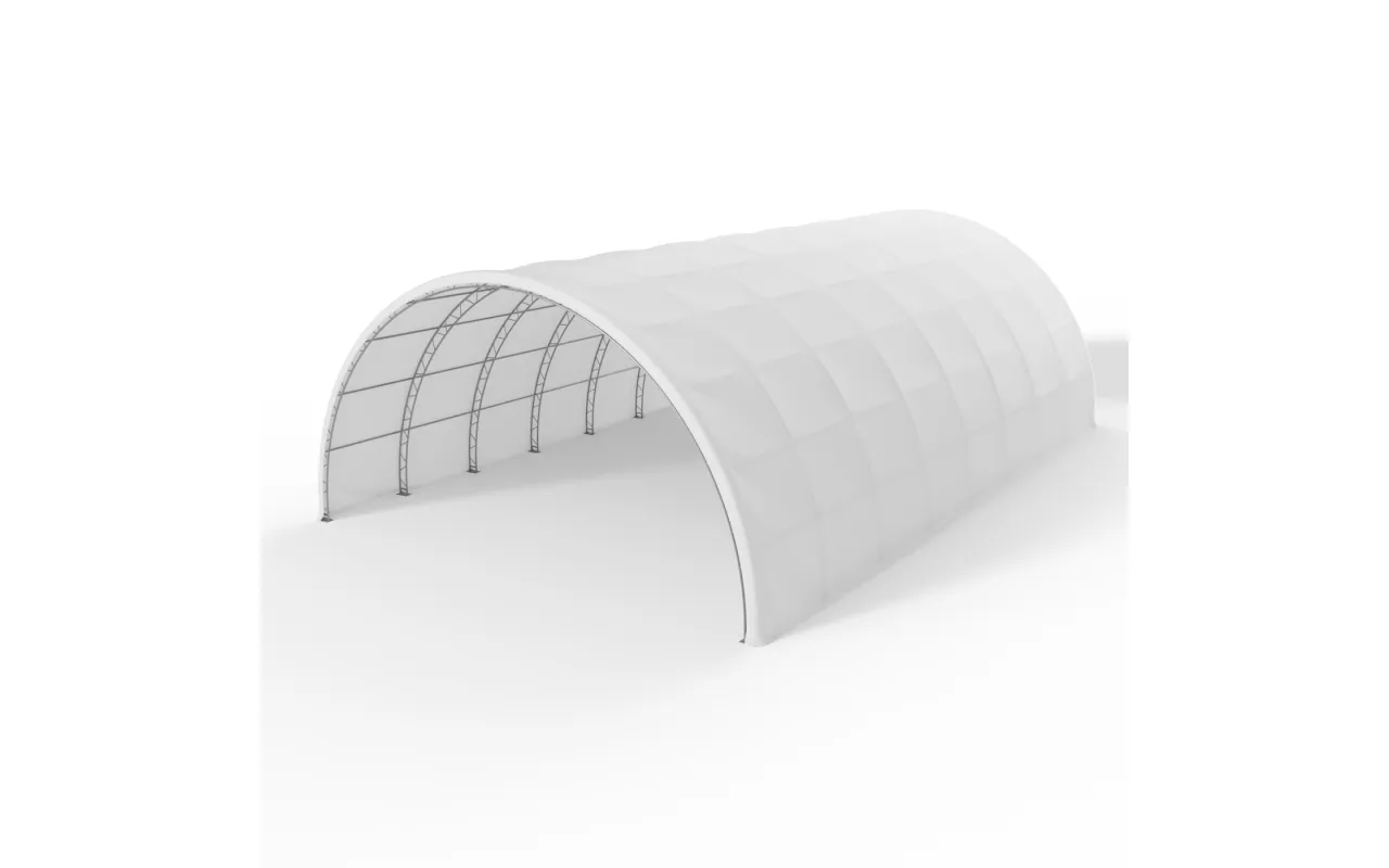 Oblouková hala 15,25x36,6 m PVC 750 g/m² je postavena na samonosné ocelové konstrukci z oválných nebo příhradových profilů, které jsou žárově zinkovány pro maximální ochranu proti korozi. Robustní rám nevyžaduje žádné dodatečné podpěry uvnitř, což zachovává plnou funkčnost vnitřního prostoru. Opláštění je vyrobeno z nehořlavé PVC plachty dostupné ve standardní verzi (750 g/m²) nebo zesílené (900 g/m²), která poskytuje vysokou odolnost proti tahu, mechanickému poškození i vůči UV záření, dešti, sněhu a větru. Bílá barva plachty napomáhá přirozenému osvětlení pracovního prostoru a zároveň omezuje přehřívání interiéru. Modulární konstrukce navíc umožňuje budoucí rozšíření haly, což z ní činí flexibilní a dlouhodobé řešení – ať už potřebujete prostor na několik sezón, nebo jako trvalé logistické zázemí.