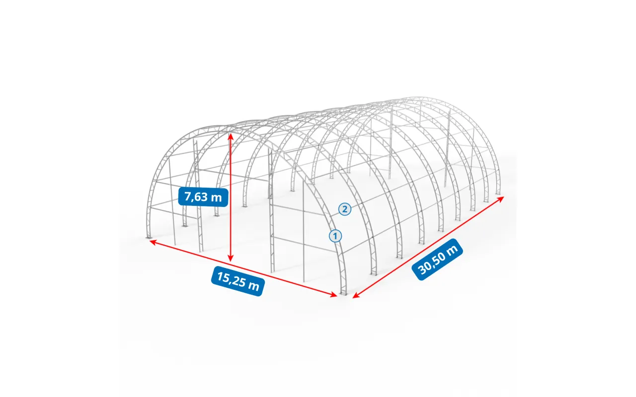 Model 15,25×30,5 m v zeleném provedení je pro farmy i firmy, které potřebují velkokapacitní a přehledné skladové zázemí. Plášť z PVC 750 g/m² kombinuje odolnost vůči vlhkosti a UV záření s barvou, která dobře zapadá do venkovního prostředí. Příhradová konstrukce zajišťuje dlouhou životnost a montáž na základové patky přináší stabilní provoz i při proměnlivém počasí. Čelo s ručními rolovacími vraty a zadní stěna uzavírají prostor. Zeptejte se poradce na vhodnost pro váš provoz.
