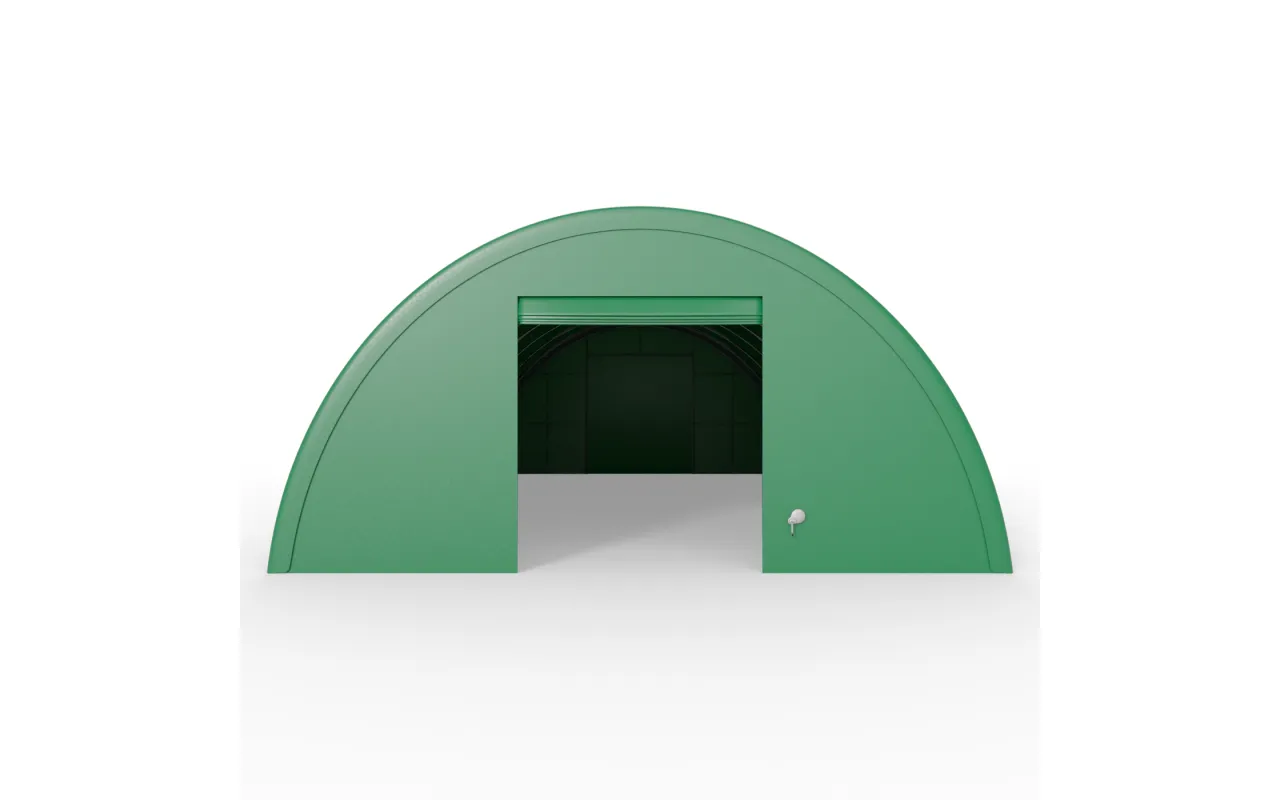 Zelená varianta obloukové haly 12,2x18 m je vhodná pro zákazníky, kteří chtějí řešení přirozeně zapadající do okolí. Zesílená konstrukce s dvojitou příhradovinou a plachta PVC 750 g/m² zajišťují ochranu před počasím a dlouhou životnost v každodenním provozu. rolovací brána s klikou umožní vjezd i větším vozidlům a uzavřená zadní stěna zvyšuje bezpečnost uložených věcí. Vhodné jako sezónní sklad nebo garáž pro stroje.