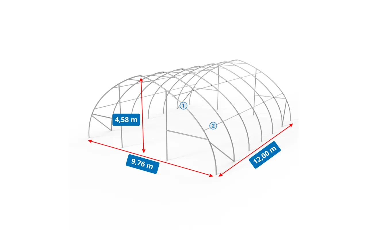 Konstrukce plachtové haly Plachtová hala 9,76x12 m PVC 900 g/m² se vyznačuje použitím nosných trubek a spojovacích prvků se zvětšeným průměrem, což výrazně zvyšuje celkovou stabilitu systému. Srdcem celé konstrukce je ocel – proto používáme za studena válcovanou konstrukční ocel. Rámové prvky jsou navíc perforované a nevyužívají žádné svary. Tato technologie zajišťuje maximální odolnost vůči statickému i dynamickému zatížení a chrání konstrukci před deformacemi. Pro ochranu rámu plachtových hal jsou všechny ocelové komponenty galvanicky pozinkované. Tento proces zajišťuje komplexní ochranu proti korozi – jak vnitřní, tak vnější. Díky tomu jsou ocelové trubky dlouhodobě chráněny před rzí. Střešní a boční napínací systém je tvořen robustními ocelovými lany, která zajišťují stabilitu konstrukce a brání jejímu deformování během celé doby používání. Zároveň chrání plachtu před tlakem sněhu a větru. Integrovaný napínací systém je klíčovým prvkem haly Plachtová hala 9,76x12 m PVC 900 g/m², protože udržuje plachtu napnutou, čímž zabraňuje vzniku záhybů a tvorbě vodních kapes na povrchu. Díky tomu je hala účinně chráněna před nepříznivými povětrnostními podmínkami, jako jsou silné poryvy větru nebo déšť. Tento systém navíc přispívá k estetickému vzhledu haly a dodává jí profesionální charakter.