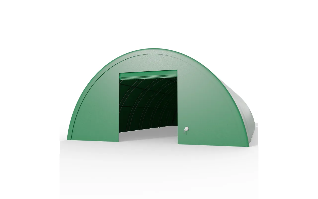 Zelená oboustranná stěna pro tunelovou halu 12 m, postavená na ocelovém rámu a krytá plachtou PVC 750 g/m². Rolovací vrata zrychlují přístup dovnitř a přírodní barevnost se hodí do prostředí zemědělské provozy i zelených ploch. Jednoduchá montáž bez základů. Kontaktujte nás pro ověření kompatibility s vaší halou.